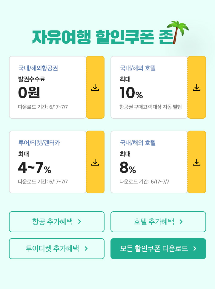 | 해외 숙소/액티비티 | 에어서울 (마이리얼트립), 인터파크투어 (미국관광청) | 제휴 프로모션, 특정 지역/테마 특화 할인 | 숙소 최대 10만원 할인(에어서울), 미국 숙소 50% & 항공 3만원 할인(인터파크) | 단순 항공권/숙박을 넘어 자유여행 맞춤형 혜택 강화 추세. |
